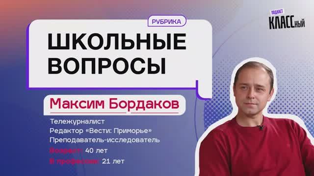 Гость подкаста: Максим Бордаков, тележурналист, редактор "Вести: Приморье", преподаватель - исследователь. А также ведущий авторской рубрики нашего подкаста "Мужские уроки". Друзья! Мы с радостью представляем вам второй выпуск нашей новой рубрики "Школьные вопросы"! Ведущие здесь- школьники нашего города! Гости подкаста - известные и интересные детям предприниматели, спортсмены, молодые педагоги, журналисты, деятели культуры и искусства, политики. Школьные ведущие: Кристина Погодаева, ученица гимназии №2 города Владивостока; Елизавета Павловская, ученица гимназии №2 города Владивостока. Партнер рубрики: Российское движение детей и молодёжи «Движение Первых» Приморского края Проект запущен по инициативе мэра Владивостока Константина Шестакова. Делитесь нашим контентом и ищите нас в социальных сетях! ТГ: https://t.me/klassnyypodkast ВК: https://vk.com/public218702092