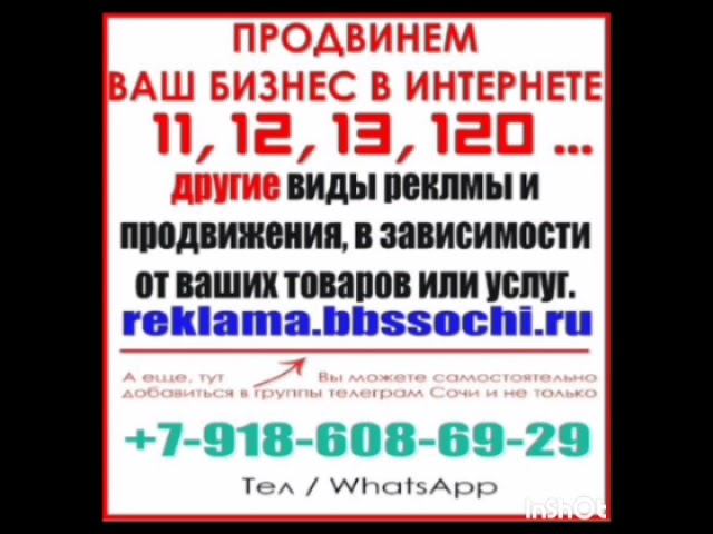 Запишите, *ВСЕГДА ПРИГОДИТСЯ:* РЕКЛАМА В ИНТЕРНЕТЕ, (*РАСКРУТИМ ВАШ БИЗНЕС – ТОВАРЫ, УСЛУГИ, САЙТЫ*): *ЦЕНА, варианты, скидки:* https://reklama.bbssochi.ru *ВНИМАНИЕ:* Возьмёт на себя раскрутку ваших услуг, фирм, сайтов, товаров, продвижение и рекламу в интернете: + ДОБАВИМ ВАС: в ВАТСАП группы: +7-918-608-69-29 в ТГ группы: https://t.me/Andrey220280 +79882316877 *Или добавляйтесь сами:* https://www.groups-sochi.bbssochi.ru *Рекламное агентство* «ББС СОЧИ» 1. *Сайт:* https://reklama.bbssochi.ru 2. *Скидки и новости Сочи:* https://bbssochi.ru 3. *Скидки на маркетплейсах:* https://saterno.ru 4. *Все услуги Сочи:* муж на час, ремонт квартир в Сочи: https://uslugi-byta.ru 5. *Форум Сочи,* ответы на все вопросы: https://forum.bbssochi.ru 6. *Все группы объявлений Сочи в ТГ:* https://t.me/addlist/W5JiGz0XFNpiZmQy 7. *Ссылки на группы ТГ:* https://www.groups-sochi.bbssochi.ru 8. *Бесплатная доска объявлений:* https://board.bbssochi.ru Ватсап: +7-918-608-69-29 ТГ: https://t.me/Andrey220280 +7-988-231-68-77 #сочи #реклама #группы