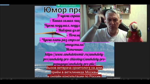 Новый цикл очень коротких видео под названием "Юмор про птиц". Продолжение следует. Ставим пальчики, подписываемся на канал и делимся видео. А если у вас вдруг заболела птица то милости ко мне на мой сайт, там каждый найдет, то что ему нужно. www.e-ornitologonlain.ru Полезные видео смотрим ссылки ниже https://dzen.ru/video/watch/661eaf6e644cdb36af8c0abf Правильное кормление мелких попугаев. https://dzen.ru/video/watch/660c6122a4f78730c576e692 Простой способ взвесить птицу. https://dzen.ru/video/watch/660574051100b61f1f419144 Как правильно фиксировать мелкого и среднего попугая. https://dzen.ru/video/watch/6604561a95d4e1136b712756 Как правильно давать лекарство в клюв попугаю. https://dzen.ru/video/watch/668ae6ed8b2d8178676fa332 Как определить травму лапки у птицы. https://dzen.ru/video/watch/668ae5a1ac340e4b0d511b7f Как определить травму крыла у птицы. #юморптицы #анекдотыпроптиц #орнитологчитаетАнекдоты #лечениептиц #лечениепопугаев #ветврачорнитолог #птицы #вевтрачорнитологЧугуевский Мой канал в Teams teams.live.com/...dgm Мой канал в Макс max.ru/...gt0 Мой личный сайт e-ornitologonlain.ru Берегите и любите своих пернатых питомцев и они ответят вам взаимностью. Ветврач орнитолог Чугуевский Владимир.
