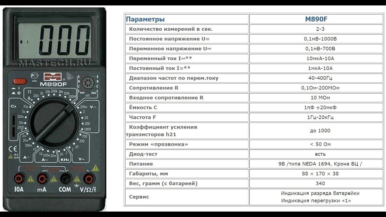 https://pulse.mail.ru/source/816515069625691788/ Обзор Цифровой мультиметр Mastech M890F #мультиметр_Mastech_M890F #Mastech_M890F #M890F Цифровой мультиметр Mastech M890F производит измерения силы постоянного и переменного тока, величины постоянного и переменного напряжения, сопротивления и коэффициент усиления биполярных транзисторов (h21), емкость конденсаторов и частоту в звуковом диапазоне. Так же с помощью мультиметра M890F можно прозванивать полупроводниковые диоды. Результаты измерений выводятся на цифровой 31/2 -разрядный ЖК-дисплей. Питание мультиметра осуществляется от одной батареи 9В типа "Крона". В комплекте поставки мультиметра Mastech M890F входит комплект щупов и инструкция на русском языке. мультиметр, mastech, multimeter, цифровой мультиметр, обзор, мастеч, тестер, electronoff, ток, напряжение, вольтметр, обзор мультиметра, сопротивление, измерения, как пользоваться мультиметром, мультиметры, електронофф, электронофф, ms8229, измерительные приборы, review, мультиметр mastech, мультиметр цифровой, купить мультиметр, измерение напряжения, купить цифровой мультиметр, электрика, aliexpress, mastech ms8211, распаковка, обзоры, mastech ms8268, выбрать мультиметр, электроника, ms8211d, mastech ms8211d, омметр, радиолюбитель, постоянный ток, 2017, физика, блэк, емкость, ms8239c, ms8212a, амперметр, электричество, ms8211, проводка, метатроныч, #мультиметр #mastech #multimeter #цифровоймультиметр #обзор #мастеч #тестер #electronoff #ток #напряжение #вольтметр #обзормультиметра #сопротивление #измерения #какпользоватьсямультиметром #мультиметры #електронофф #электронофф #ms8229 #измерительныеприборы #review #мультиметрmastech #мультиметрцифровой #купитьмультиметр #измерениенапряжения #купитьцифровоймультиметр #электрика #aliexpress #mastechms8211 #распаковка #обзоры #mastechms8268 #выбратьмультиметр #электроника #ms8211d #mastechms8211d #омметр #радиолюбитель #постоянныйток #2017 #физика #блэк #емкость #ms8239c #ms8212a #амперметр #электричество #ms8211 #проводка #метатроныч #олеггром #mas830l #мультиметризкитая #immetatron #китай #електроноф #электроноф #прибор #тестерручка #датчикхолла