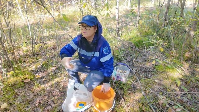 Сбор грибов в лесу Сургута.
