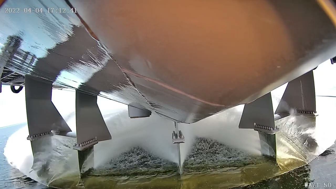 Вид на носовое крыло СПК Метеор-120Р. Разгон из водоизмещающего положения, выход на крылья, остановка с переходом в водоизмещающее положение.