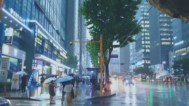 На оживленных улицах станции Каннам в Сеуле шел сильный дождь. Шум дождя. Прогулка по Учжонгу.