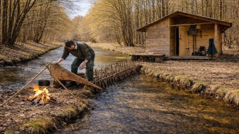Один в лесу, строю ловушку для рыбы.
