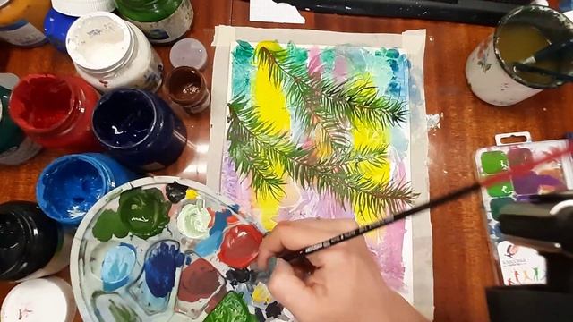Как нарисовать гирлянду на елке. Рисуем новогодний рисунок. Новогодняя открытка гуашью.