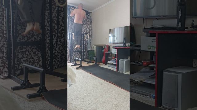 1 круг - 5 приседаний, 2 отжимания, 5 приседаний, 2 отжимания на брусьях, 5 приседаний и 2 подтягивания. 07:47 - сделал лишнее приседание